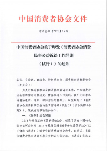 [规章制度] 中国消费者协会关于印发《消费者协会消费民事公益诉讼工作导则(试行)》的通知 日期:2021-04-16