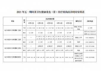 [通知公告] 2021年五一期间省卫生健康委直(管)医疗机构出诊时间安排表 日期:2021-05-06