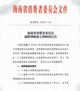 [通知公告] 海南省消费者委员会关于诚聘律师成立律师团的公告 日期:2021-04-16