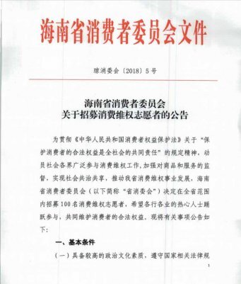 [通知公告] 海南省消费者委员会关于招募消费维权志愿者的公告 日期:2021-04-16