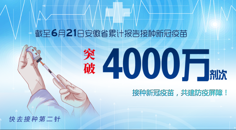 根据安徽省免疫规划信息统计,截至6月21日17时33分,安徽省累计接种新冠病毒疫苗超过4000万剂次。(安徽疫防指挥部)
