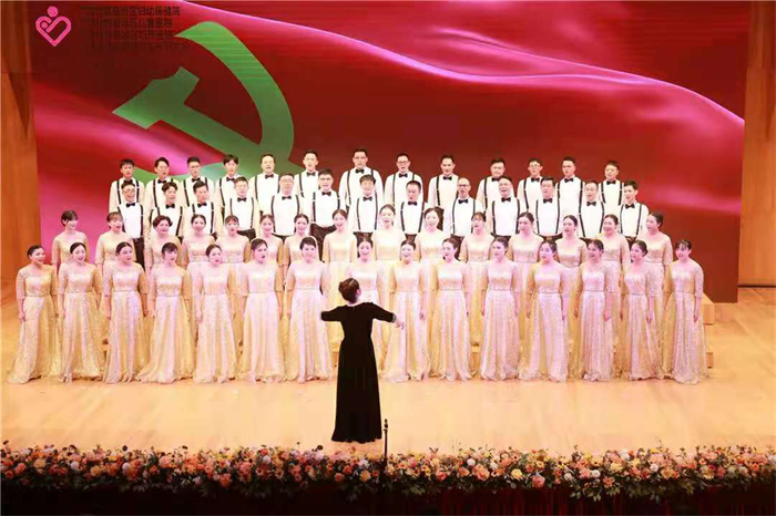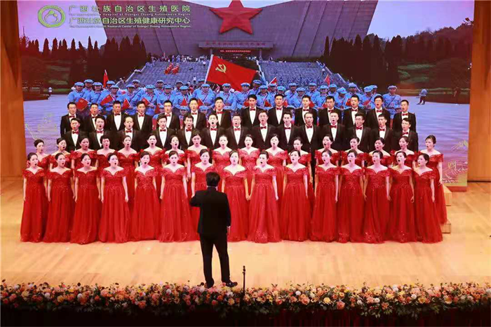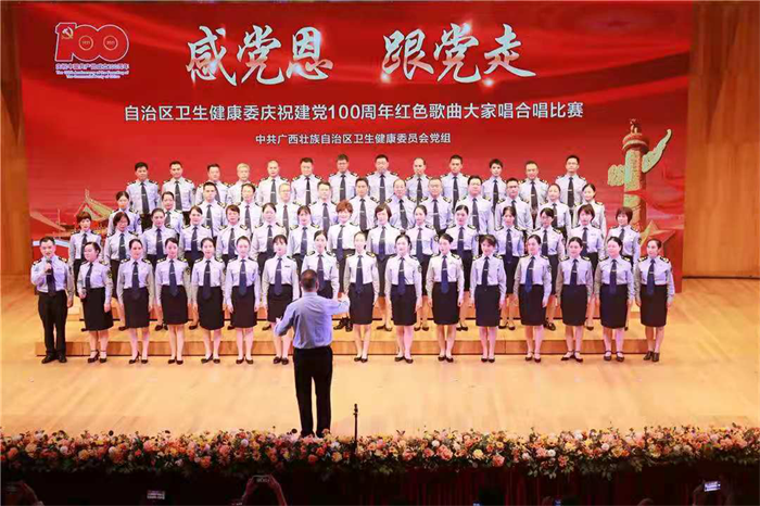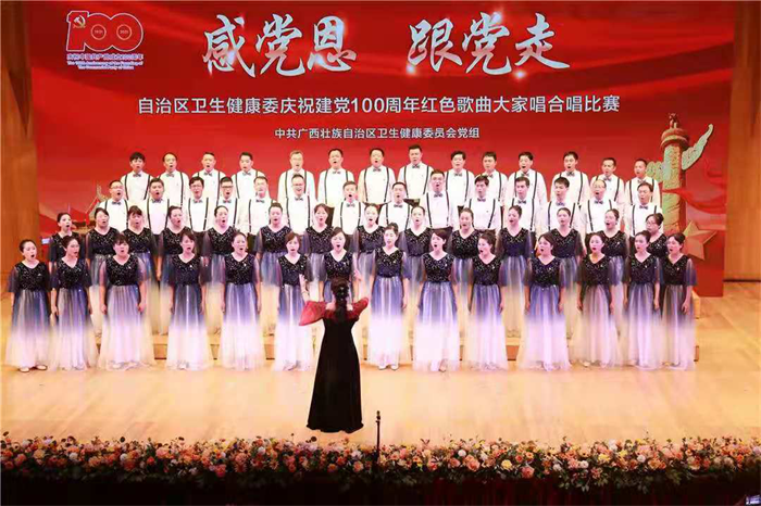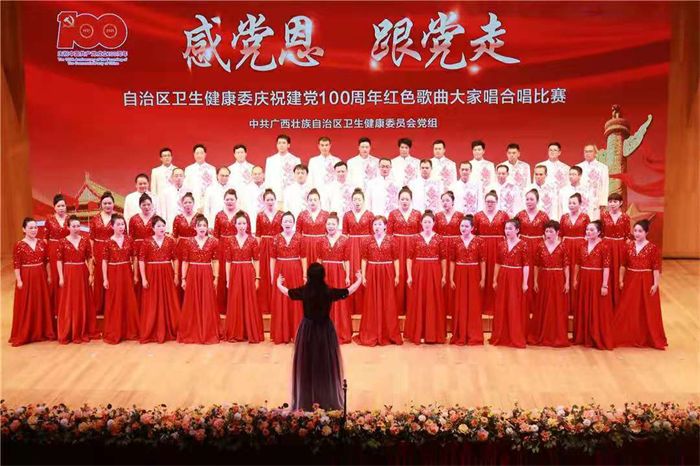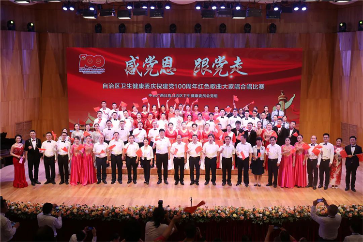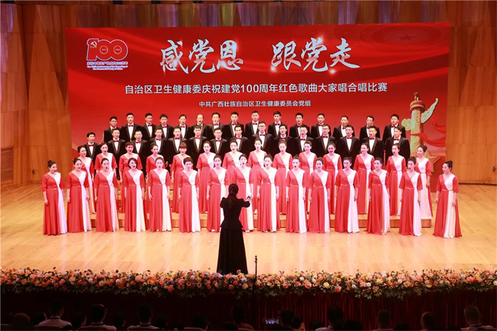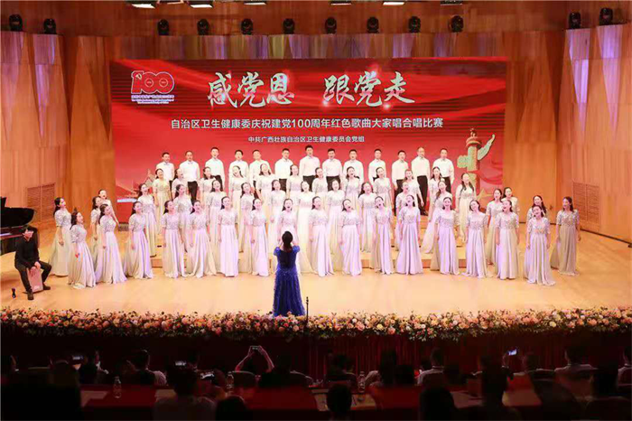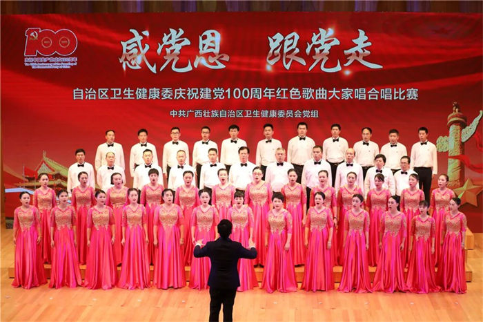 为庆祝中国共产党成立100周年,6月27日晚,“感党恩 ?跟党走”自治区卫生健康委庆祝建党100周年红色歌曲大家唱合唱比赛在广西民族宫举行。自治区卫生健康委党组书记、主任廖品琥致辞,并和在家委领导一起与现场观众们共唱红色歌曲,表达了坚定不移听党话、矢志不渝跟党走的决心。
