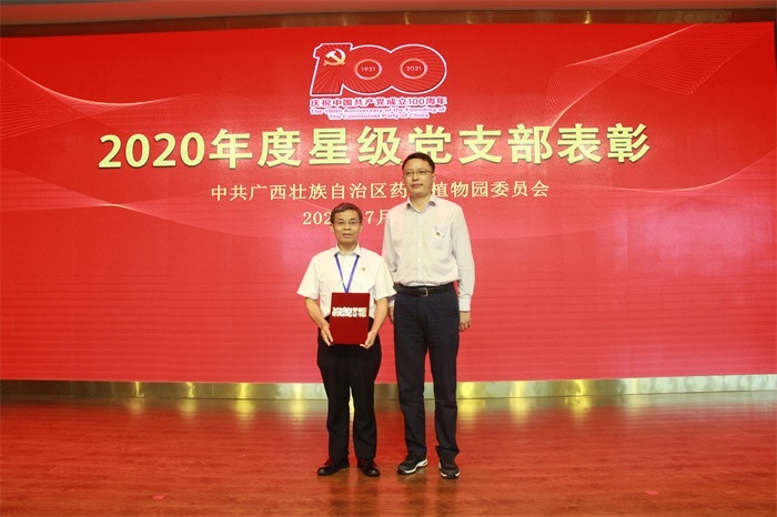 在表彰先进环节,广西药用植物园领导班子成员代表广西药用植物园党委给“光荣在党五十年”老党员颁发纪念章,为荣获“广西药用植物园2020年星级党支部”的先进党支部颁奖。