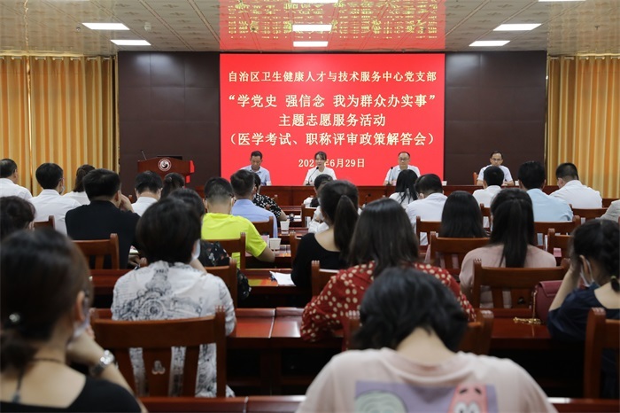 上午参观学习百色起义纪念馆、黄文秀先进事迹展之后,下午,党员同志们继续前往百色市中医医院开展“学党史 强信念 我为群众办实事”主题志愿服务活动,活动内容为:给革命老区医务人员提供医师资格考试、卫生专业技术资格中(初)级考试、高级职称专业能力考试以及卫生系列高级职称评审等有关的政策性问题解答。本次活动得到百色市卫生健康委的大力支持,市卫生健康委党组成员、副主任梁邦斌出席本次活动,来自百色市人民医院、百色市妇幼保健院、百色市中医医院等各大医院以及乡镇卫生院的63名代表参加了解答会,现场氛围浓厚,各单位参加代表积极踊跃咨询。本次主题志愿服务活动得到了百色市医务人员的一致欢迎和好评,梁邦斌表示,希望以后能开展更多类似现场解答活动,让更多医务人员受益,真正达到为民办实事的效果。