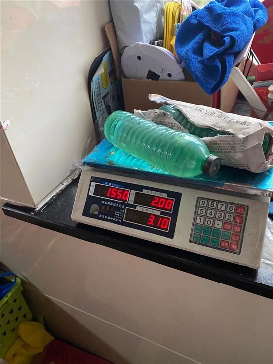 小王次日开箱才发现,箱内还包裹着两大瓶水,分别放在箱内两侧,不容易发现,放在家中电子秤上一称,这两瓶水居然有3.1斤重,而黄瓜净重只有8斤。